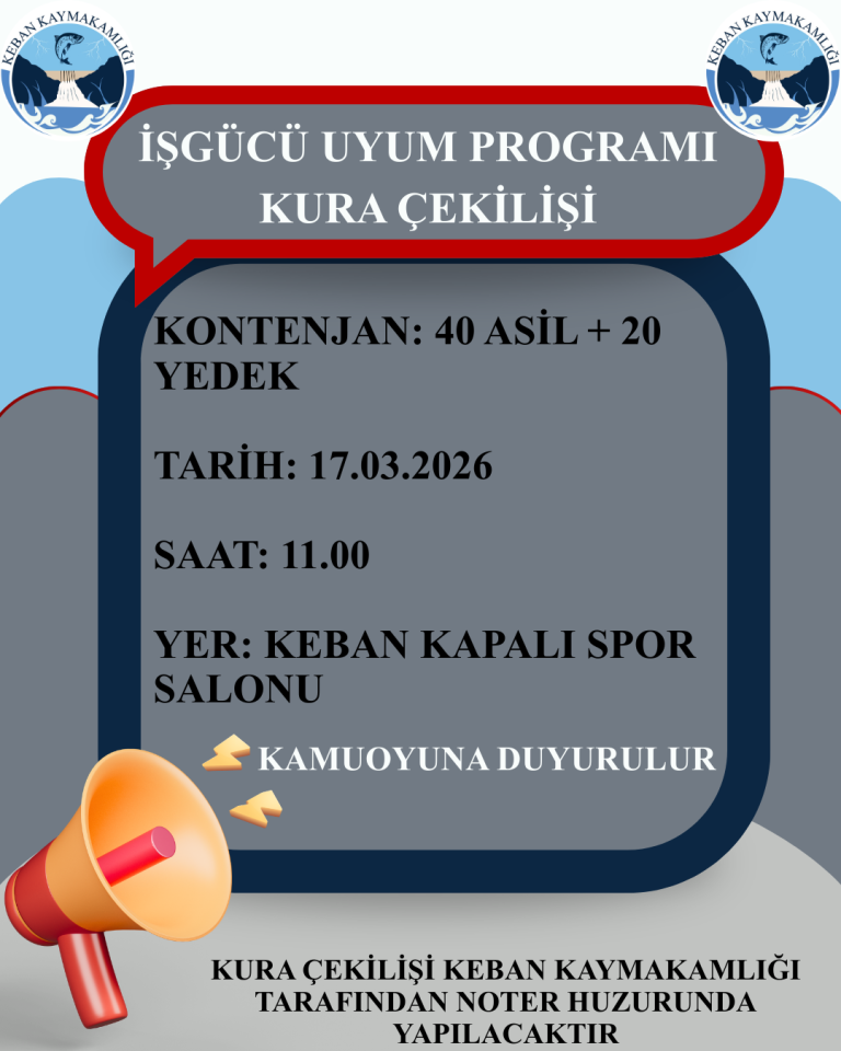 Keban Kaymakamlığı tarafından düzenlenen İşgücü Uyum Programı kapsamında yapılacak olan kura çekilişine ilişkin bilgiler aşağıdadır:​ Kontenjan: 40…